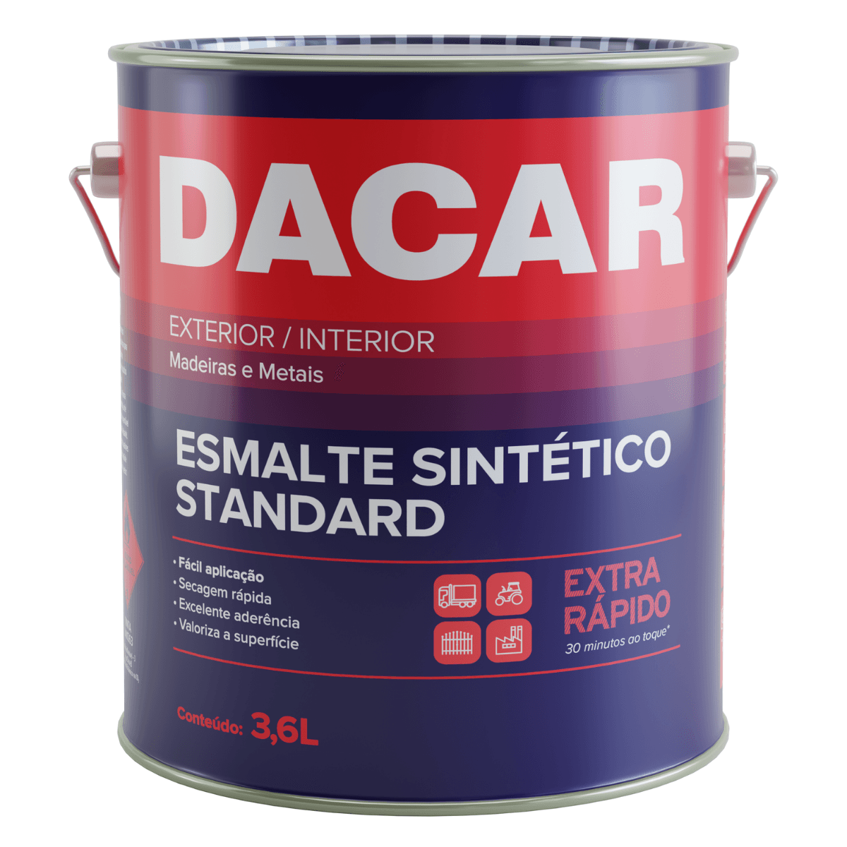 *Ferro com ferrugem: Fazer a total remoção da ferrugem utilizando lixa ou escova de aço e limpar a superfície com pano embebido em Aguarás Dacar. Aplicar uma demão de Fundo Zarcão Dacar. Aguardar secagem e aplicar a tinta de acabamento;