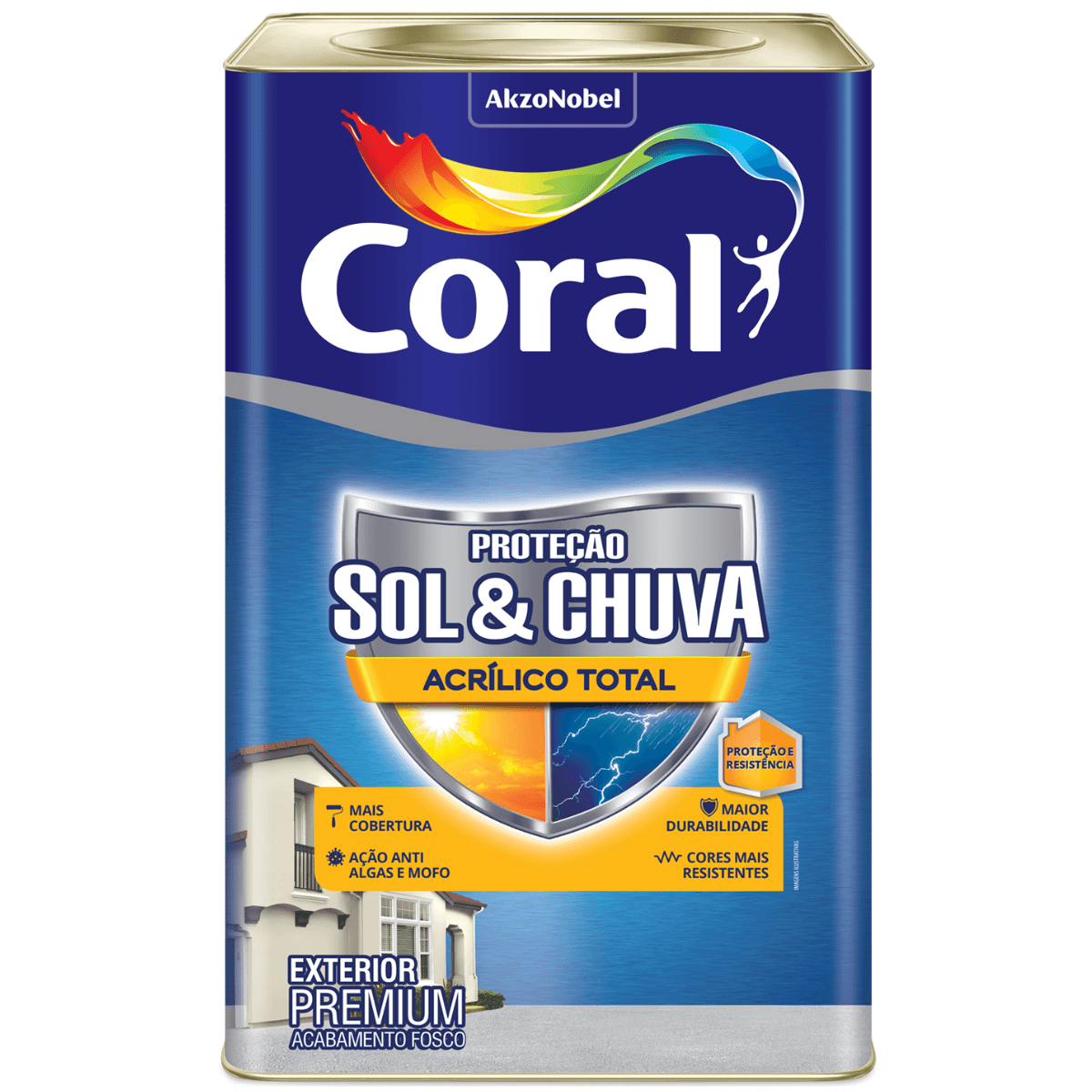 PROTEÇÃO SOL & CHUVA ACRÍLICO TOTAL é uma tinta desenvolvida especialmente para paredes externas, que proporciona elevada proteção e resistência às superfícies, além de entregar mais cobertura, ação anti algas, mofo e durabilidade para suas cores.